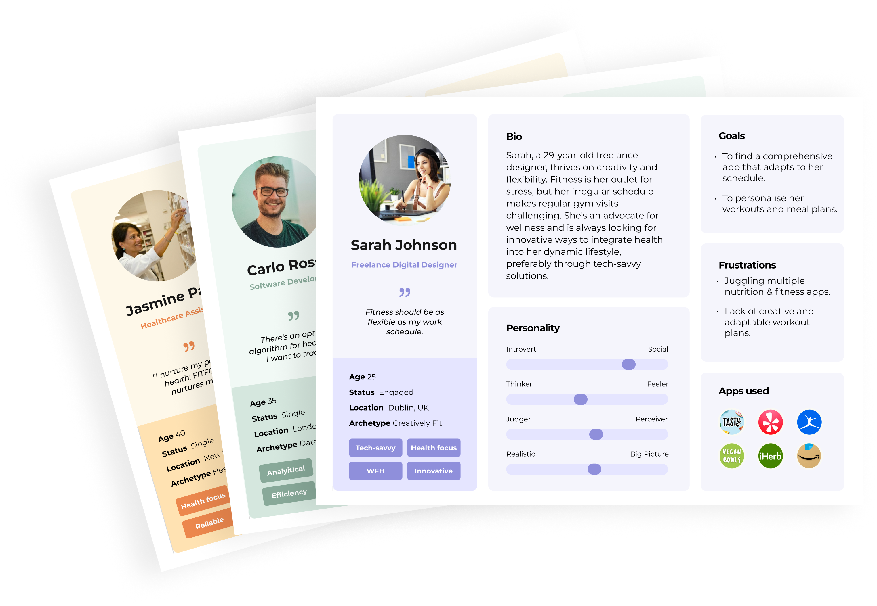 With the qualitative data collected from the market research and the user interviews, I crafted 3 user personas, detailing aspects such as age range, occupation, main characteristics, as well as goals, frustrations and app usage.
