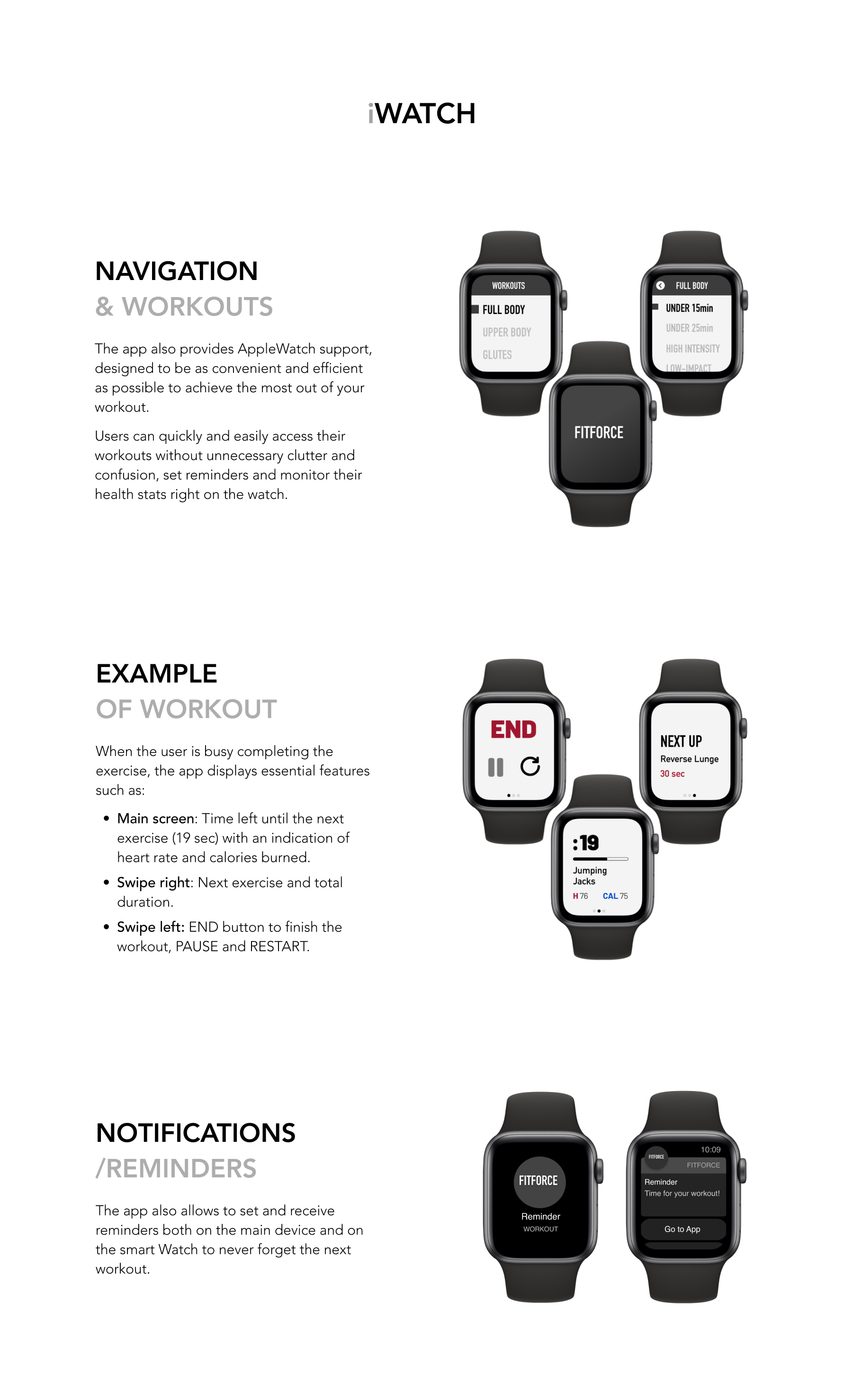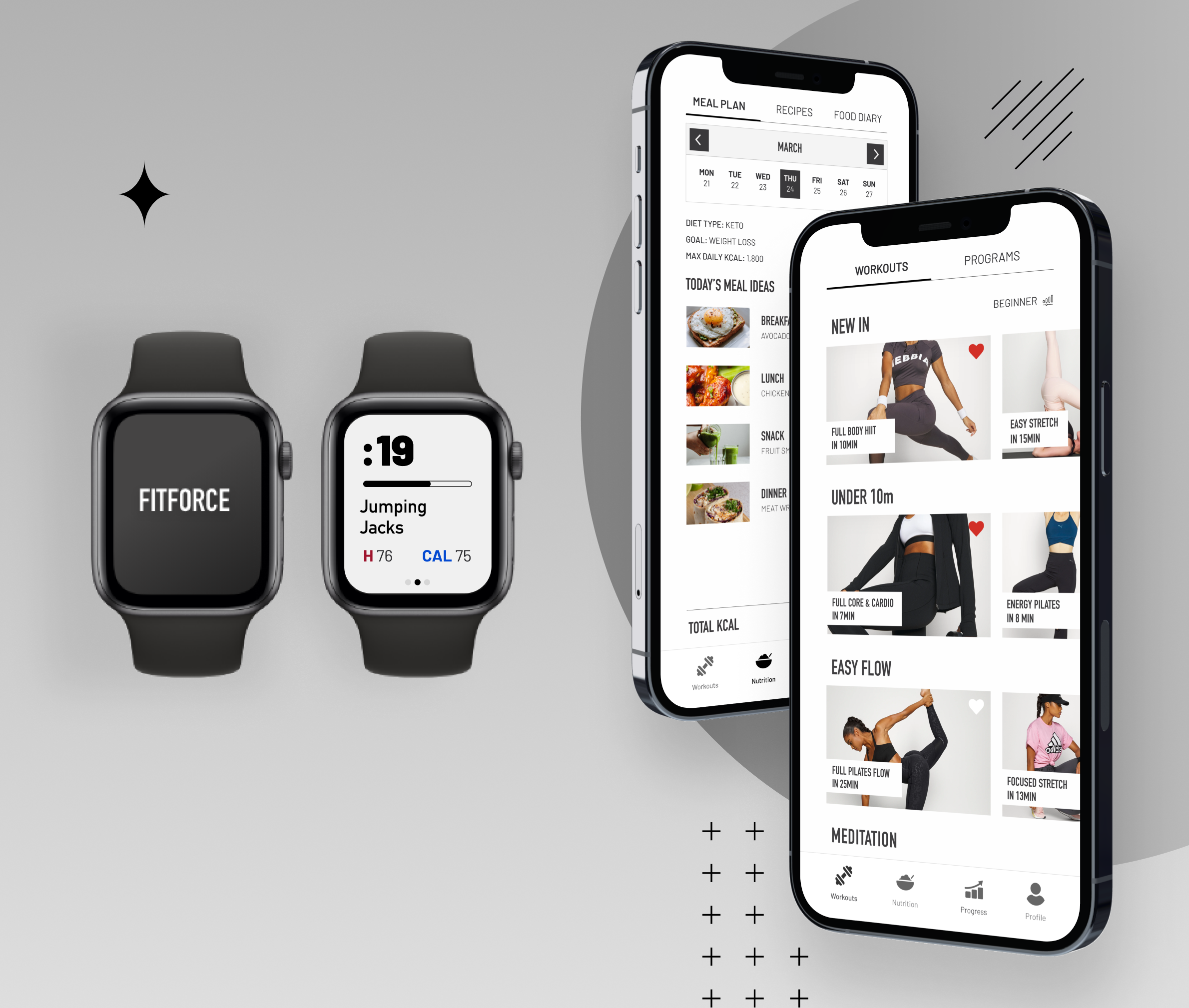 FITFORCE is a fitness app that provides a comprehensive solution that goes beyond traditional workout and meal plan apps. This project aims to provide a holistic solution for users, integrating workouts, meal planning, recipes, food tracking, and progress monitoring, as well as offering a seamless integration with Apple Watch, enhancing user experience and accessibility.