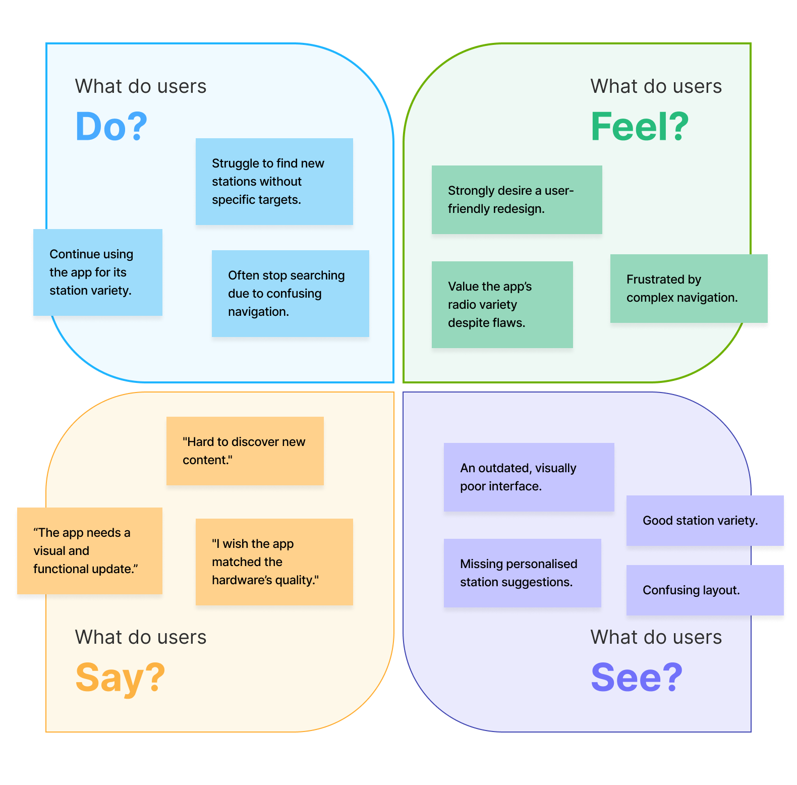 With the qualitative data collected from user surveys, I developed an empathy map to detect recurring themes among users and systematically organise them in 4 categories.