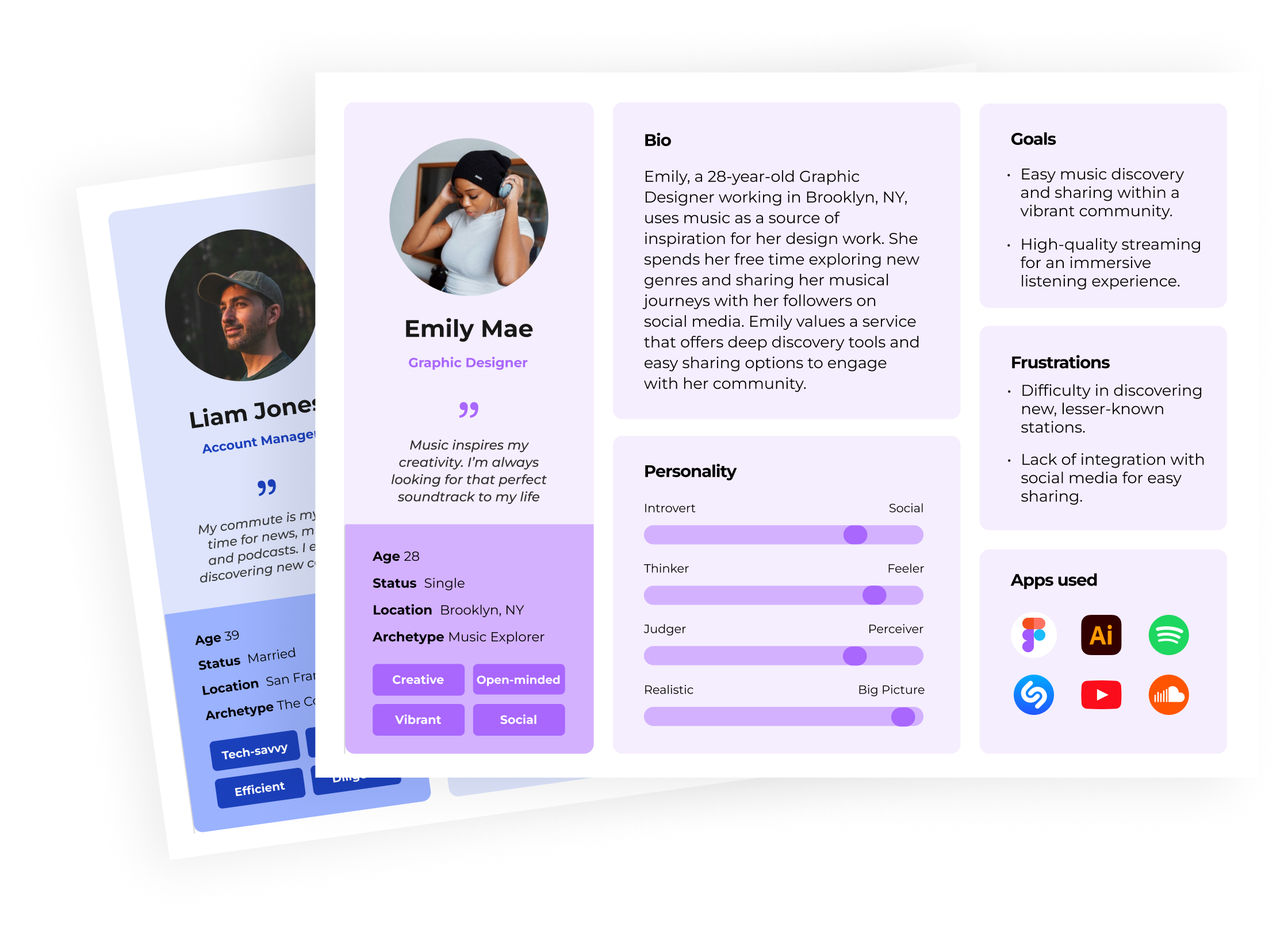 Additionally, I crafted 2 user personas to represent the target audience, detailing aspects such as age, occupation, interests, personality traits, goals and frustrations.