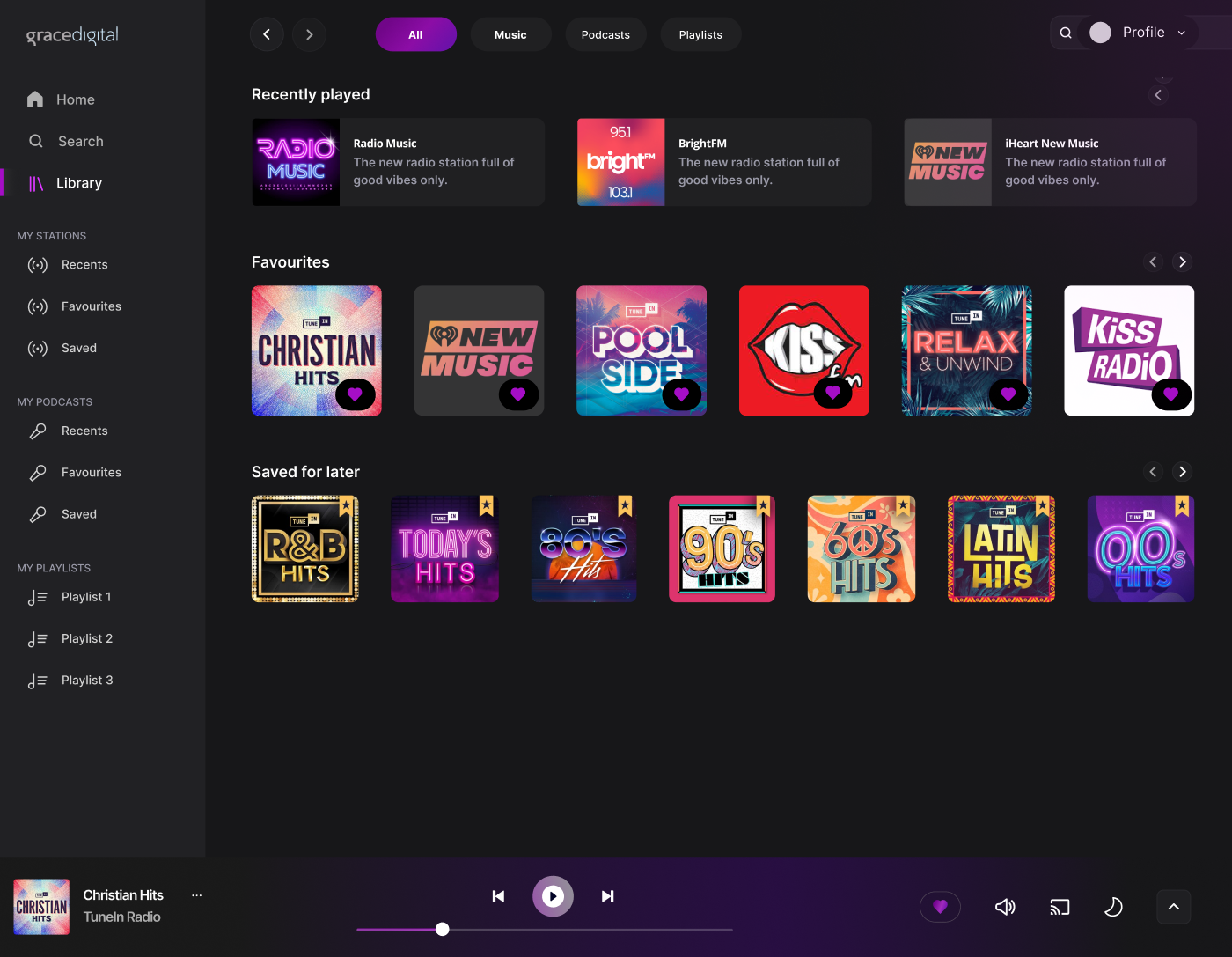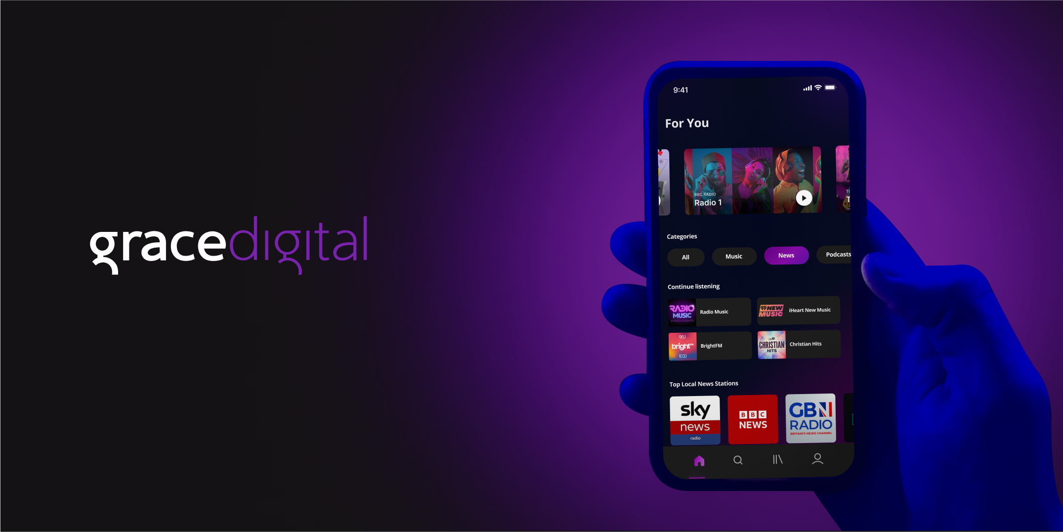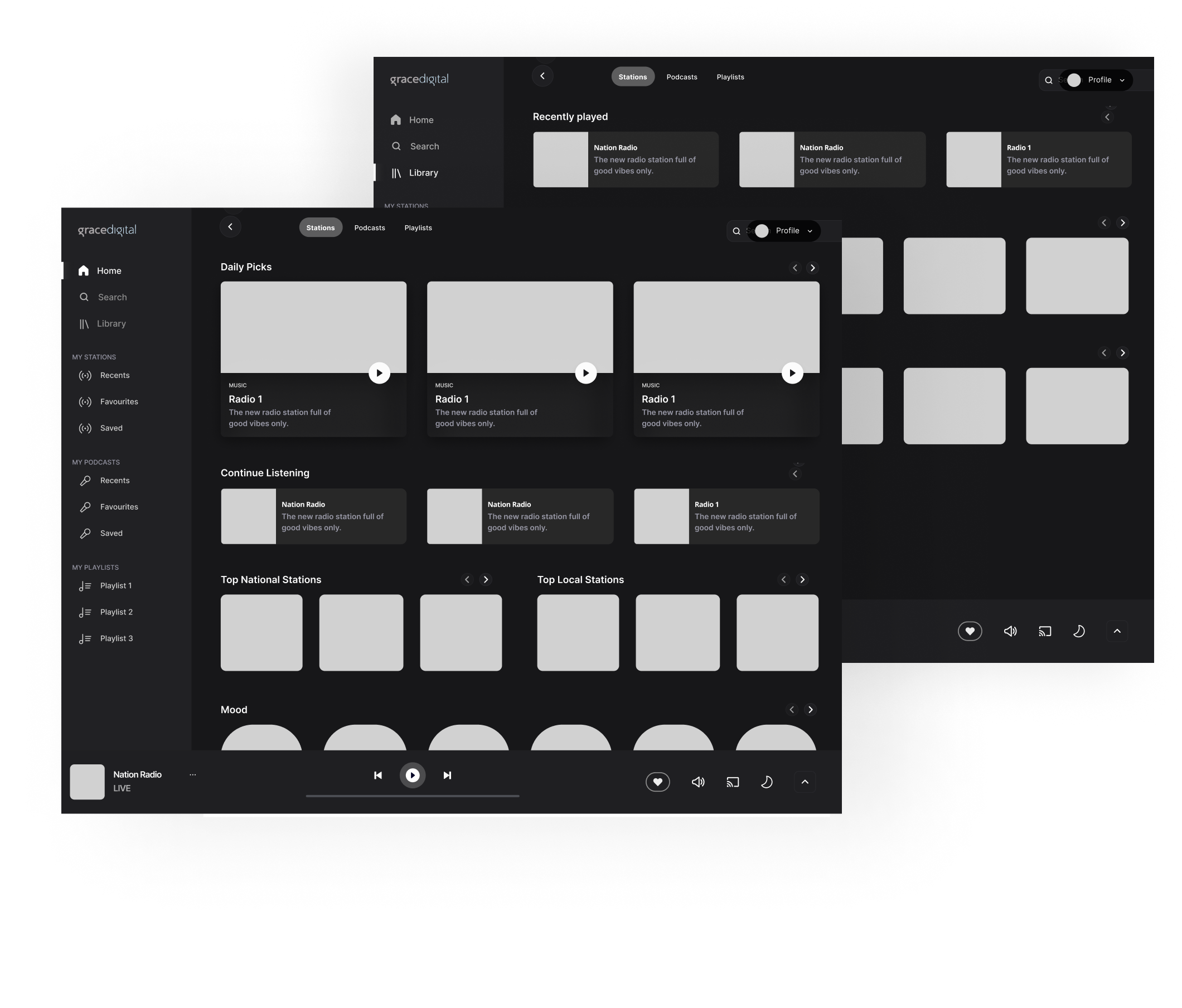 To address these challenges, the project involved a complete redesign of the Grace Digital Radio app for both web and mobile. This redesign focused on enhancing user experience through improved navigation, personalised content delivery, and a modern, visually appealing interface.