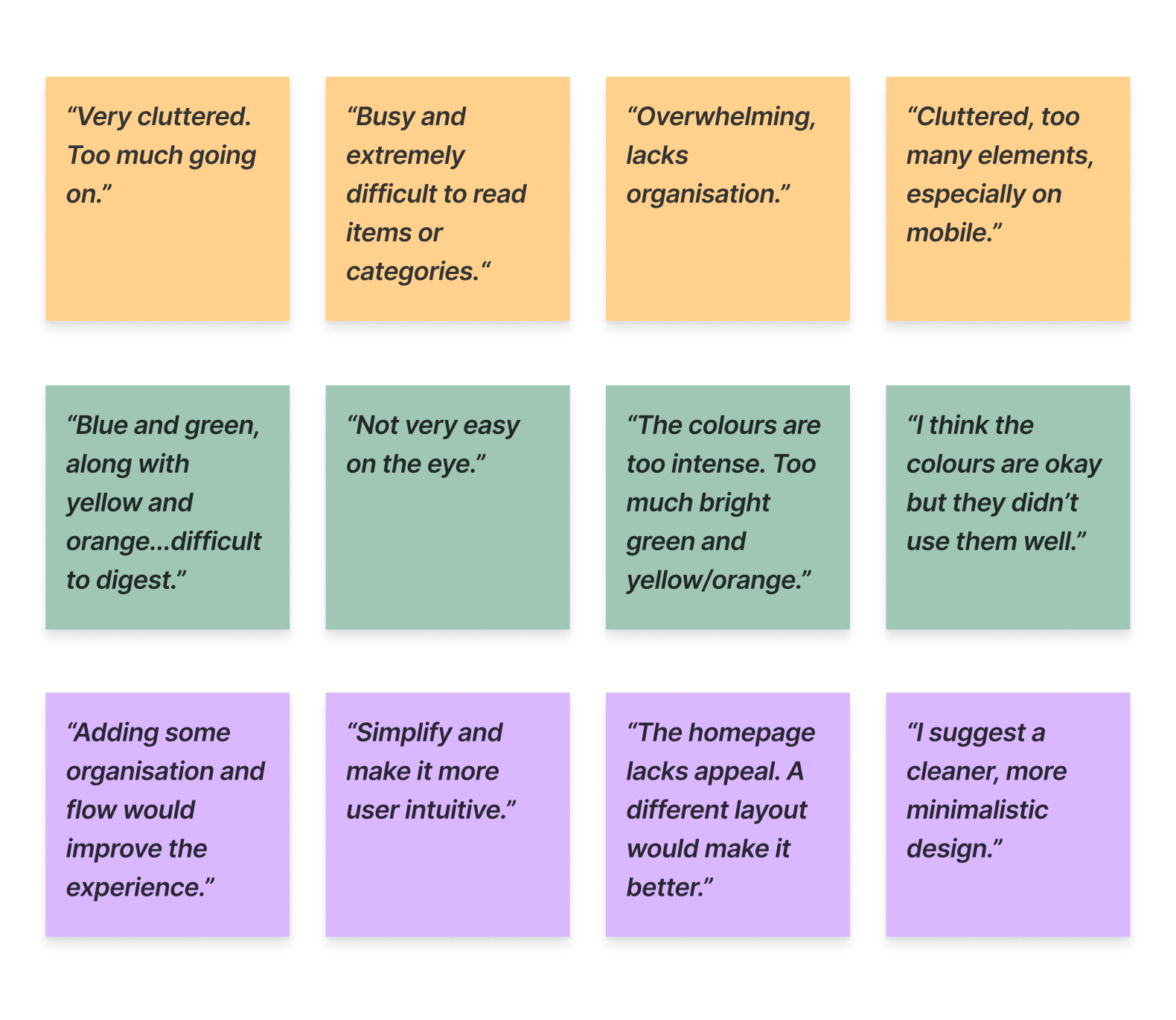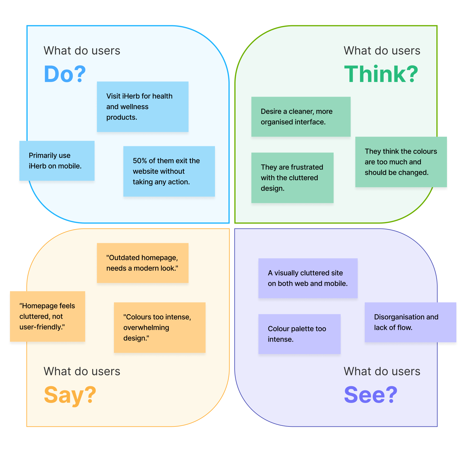 With the qualitative data collected from user interviews, I created an empathy map. This enabled me to detect recurring themes among users and systematically organise them in 4 categories.