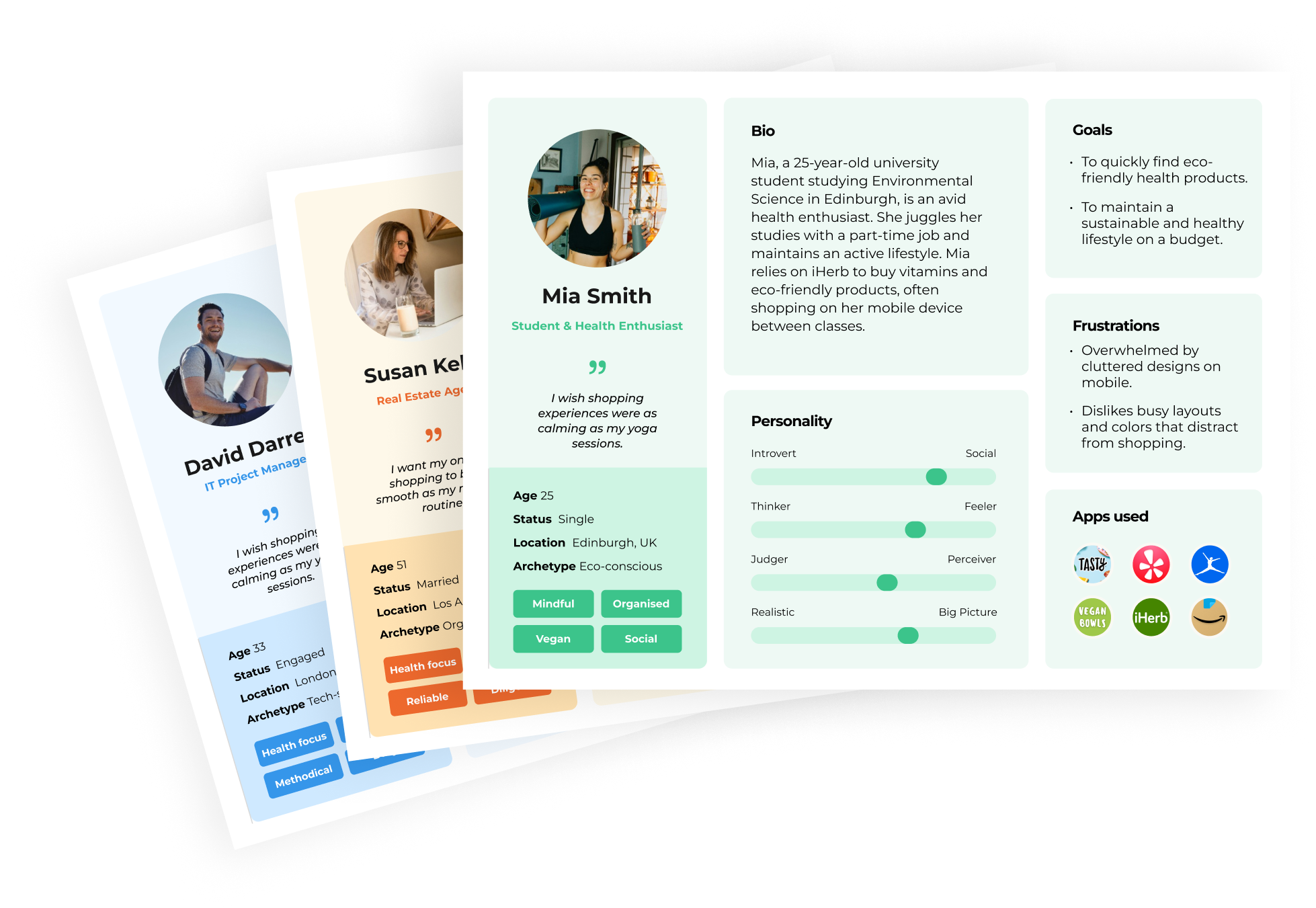 With the qualitative data collected from the market research and the user interviews, I crafted 3 user personas, detailing aspects such as age range, occupation, interests, as well as their goals and frustrations.