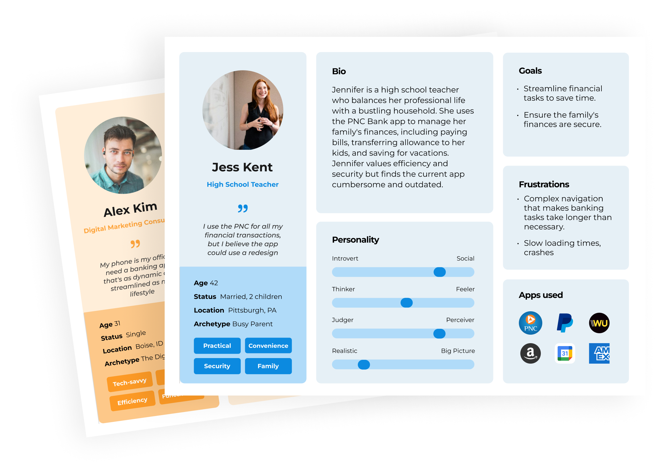 I then crafted 2 user personas that represented PNC Bank's target audience, detailing aspects such as age, occupation, personality traits, goals, frustrations.