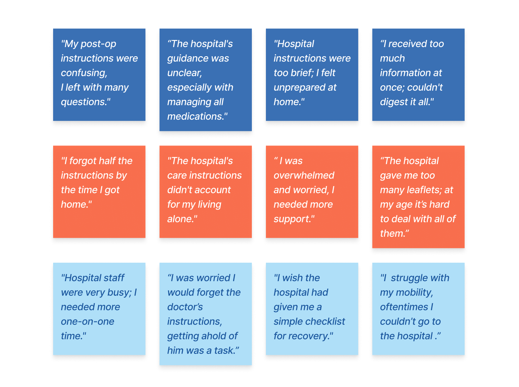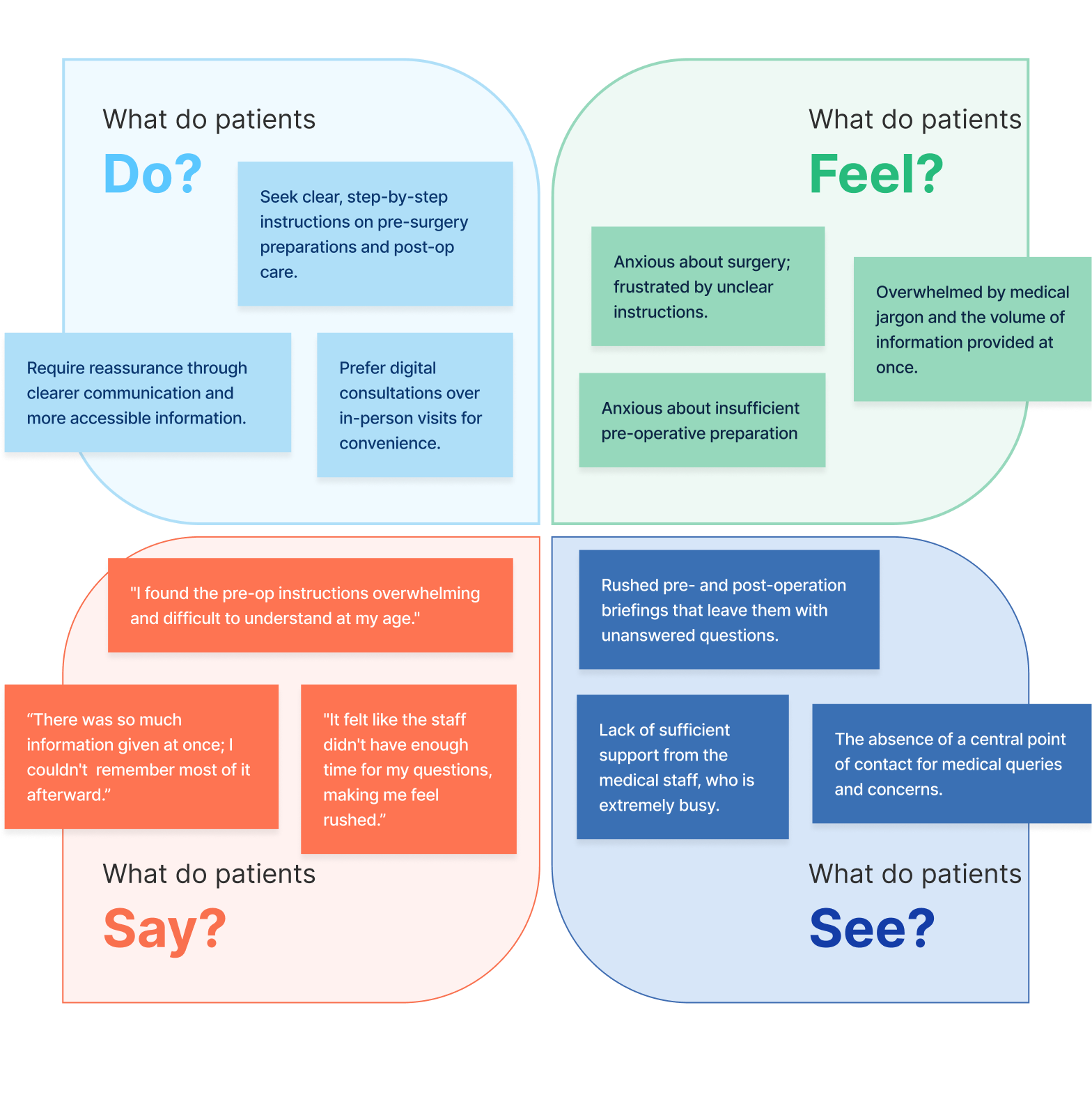 With the qualitative data collected from user interviews, I created an empathy map. This enabled me to detect recurring themes among patients and systematically organise them in 4 categories.