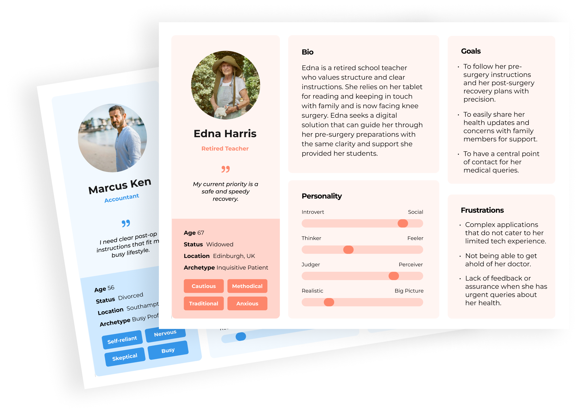 With the qualitative data collected from the user interviews, I crafted 3 user personas, detailing aspects such as age range, occupation, perosnality, goals and frustrations.