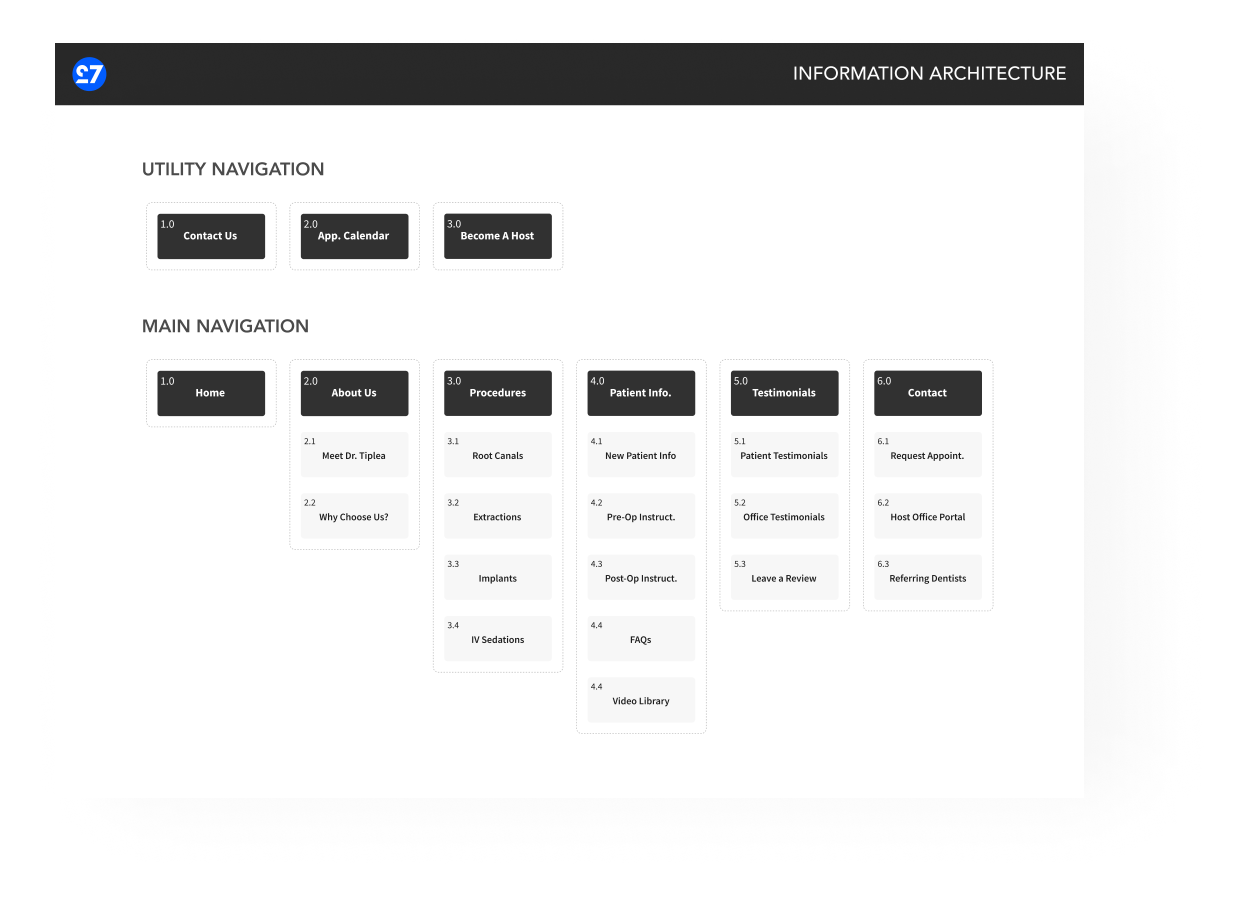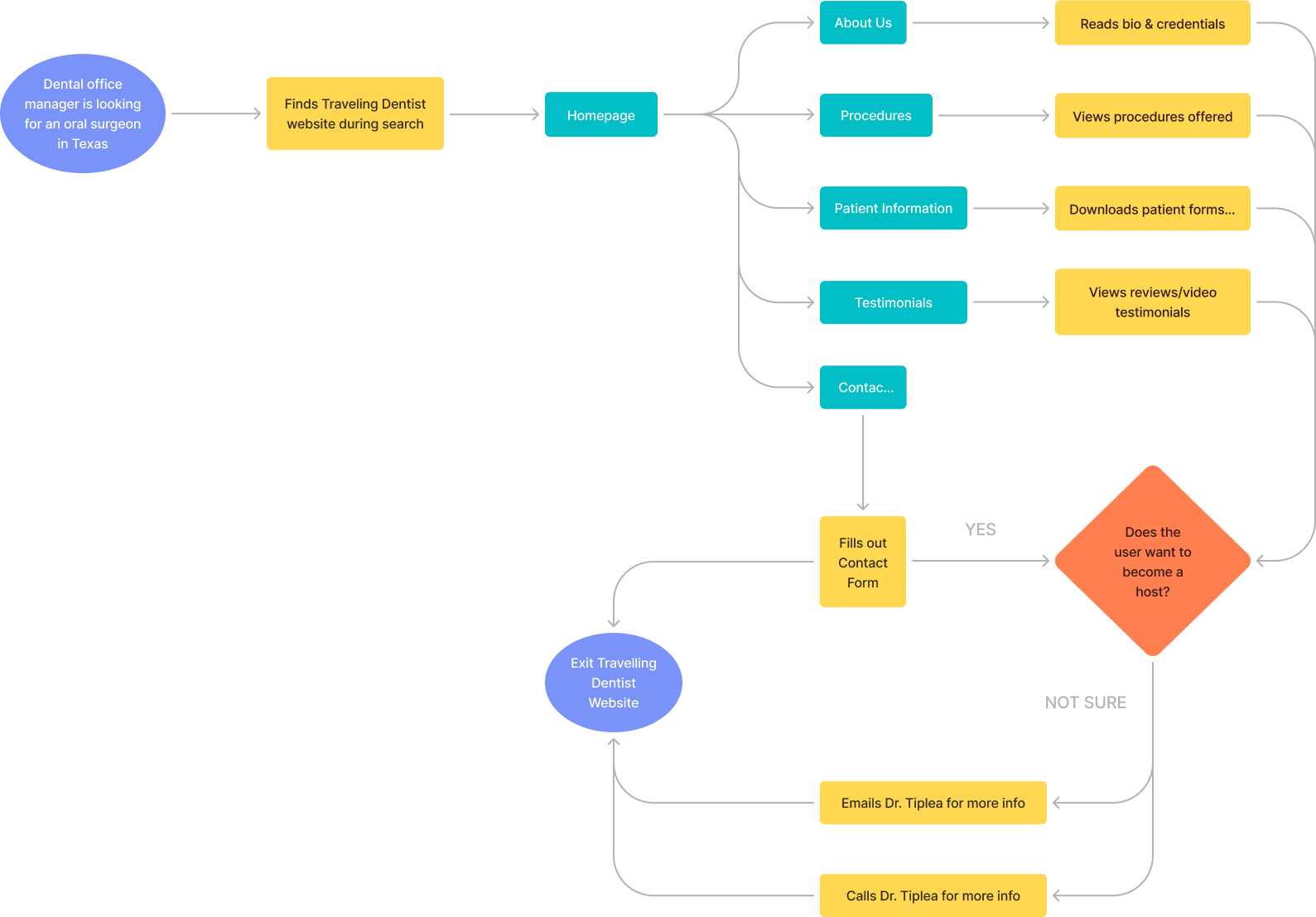 The process involved creating an information architecture to visualise the content organisation, and user flows to map out the pathways users might take through the website, ensuring a seamless journey from the homepage to booking an appointment or accessing dental health resources.